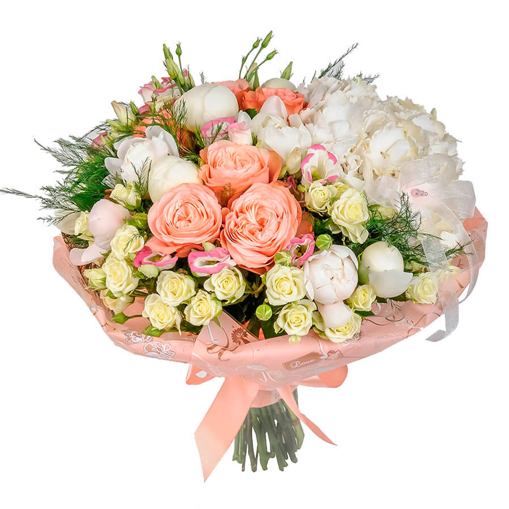 Гортензия, роза одноголовая, роза кустовая, пион, эустома, зелень.